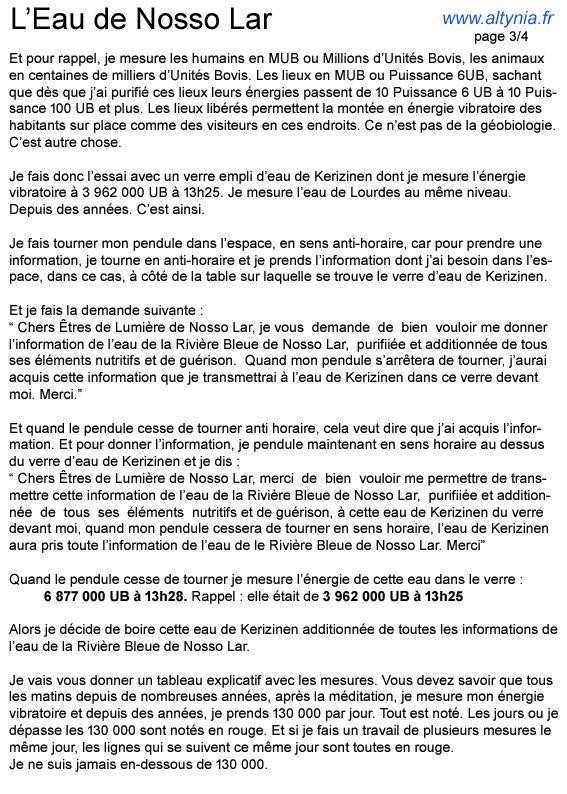 et je reviens sur la façon d'utiliser les informations de guérison de l'eau de Kerizinen magnétisée et purifiée par les bons soins de Marie et de Jésus, additionnée de ses éléments alimentaires et de guérison. Et la façon d'additionnée à cette Eau de Kerizinen toutes les informations de guérison de l'Eau de la Rivière Bleue de Nosso Lar magnétisée et purifiée par les bons soins des Ministres de l'Intuition Divine de Nosso Lar, additionnée de ses éléments alimentaires et de guérison également. Ainsi par la puissance élevée de ces doubles informations, il est plus facile d'appliquer une magnétisation efficace.