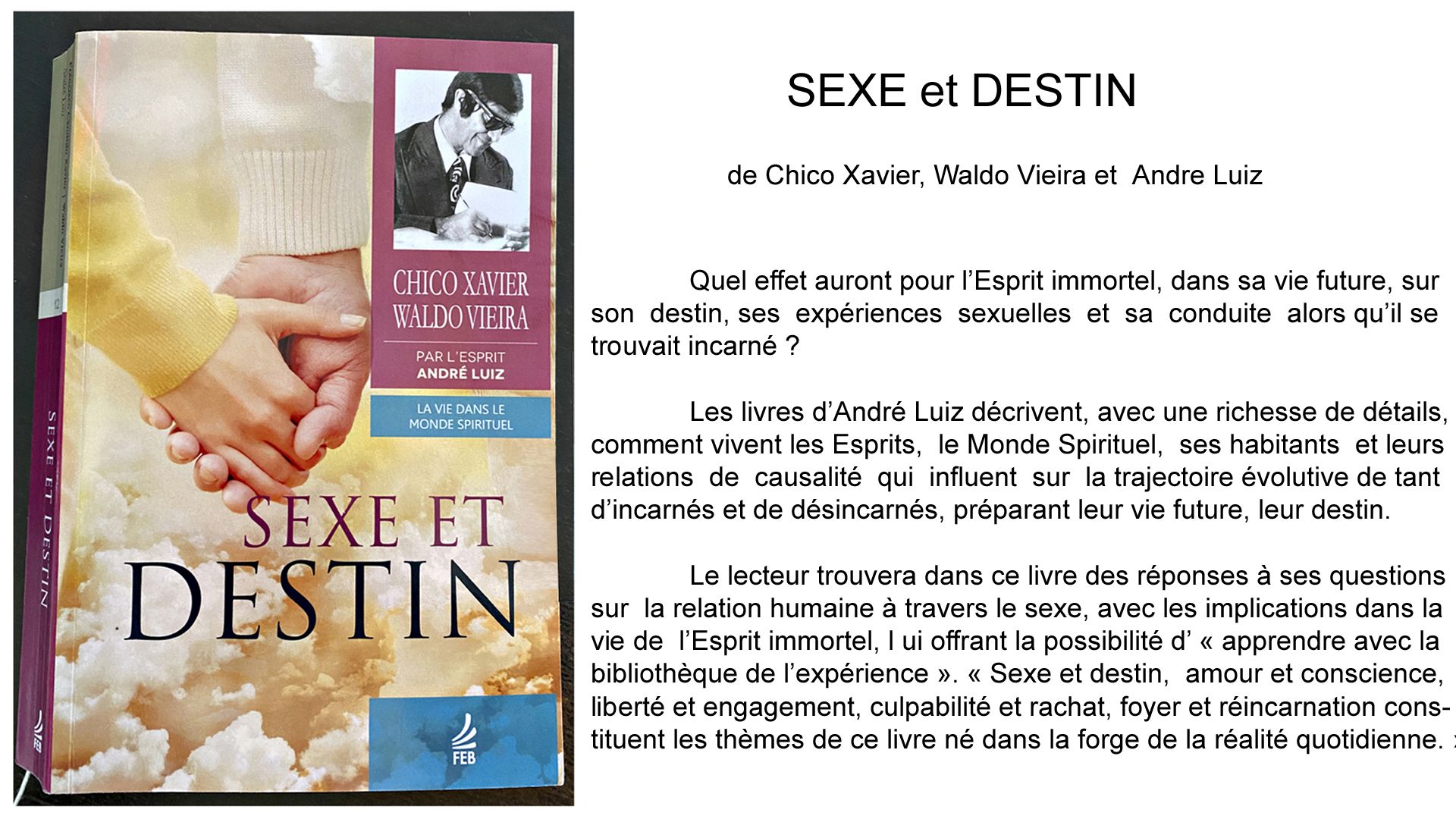 SEXE et DESTIN livre que je viens de lire et qui nous informe de l'implication de la sexualité douce, ou méchante, dans notre vie ici sur Terre et qui impliquera notre vie à venir en tant que désincarné et ensuite quand nous serons de nouveau incarné. La première partie de 192 pages est un peu longue et j'avais l'impression de m'ennuyer à lire un roman bien détaillé traitant vers la fin, du viol d'une fille par son père adoptif. Mais c'était la mise en place des personnages incarnés et désincarnés et de la fonction de chacun, et chacune, car il y des Dames aussi sur les autres plans spirituels. Je poursuis la lecture...