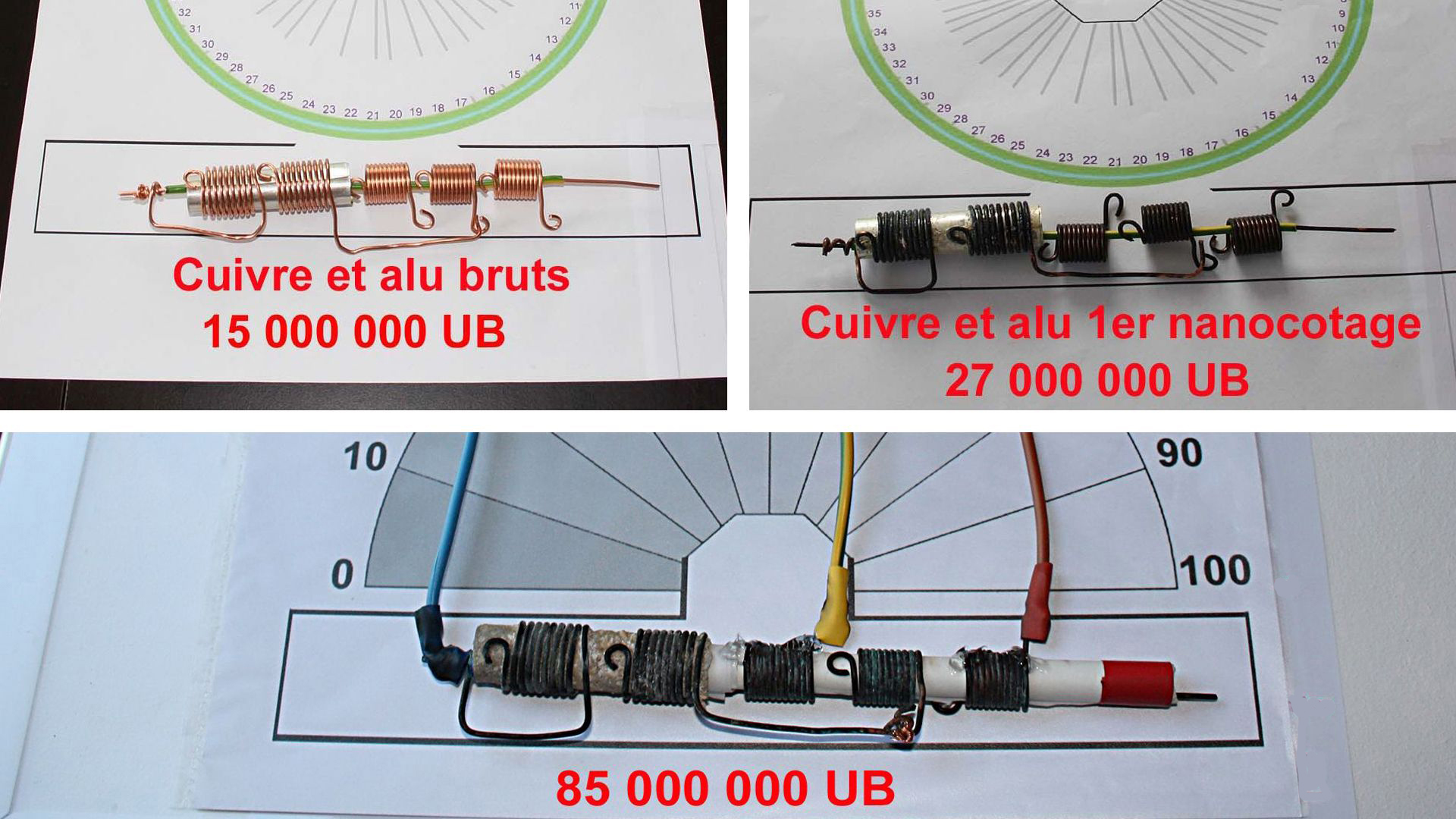 Pour l'instant je ne mesure aucun courant. Il me vient l'idée que ces bobines doivent se comporter comme des capacités. Des condensateurs. Il faudra les alimenter pour qu'elle redonne du courant. Et nous pouvons remarquer l'augmentation de ce champ mesuré, en augmentation constante depuis le cuivre brut jusqu'à la batterie terminée. Sur l'image suvante :