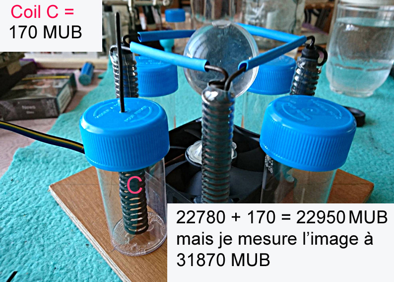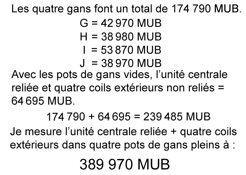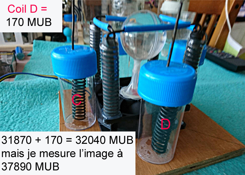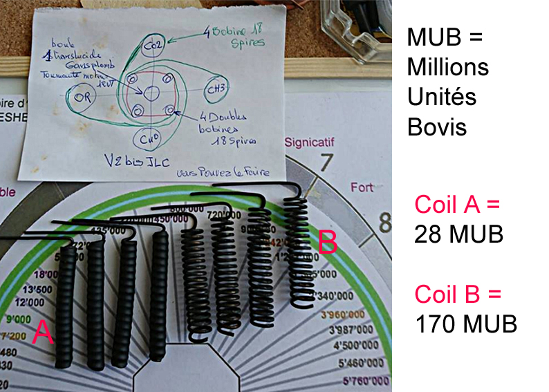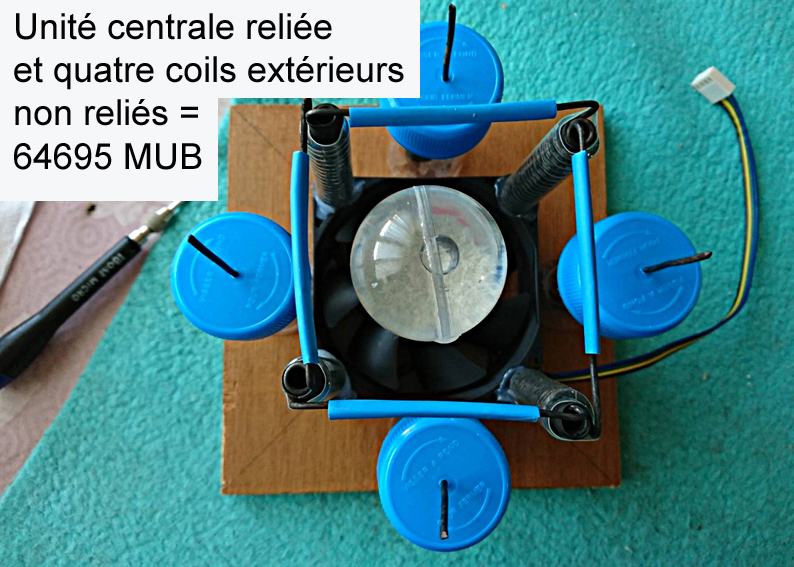 Vous allez découvrir que dans les cas des coils identiques additionnés, 1+1 ne fait pas 2 mais souvent plus et même beaucoup plus. Sauf sur la sixième image. Comme si l'ensemble avait été stressé. Je remarque que lorsque je démonte mon Générateur MUB pour faire une démonstration, il perd de son taux vibratoire, qui revient en environ trois heures.